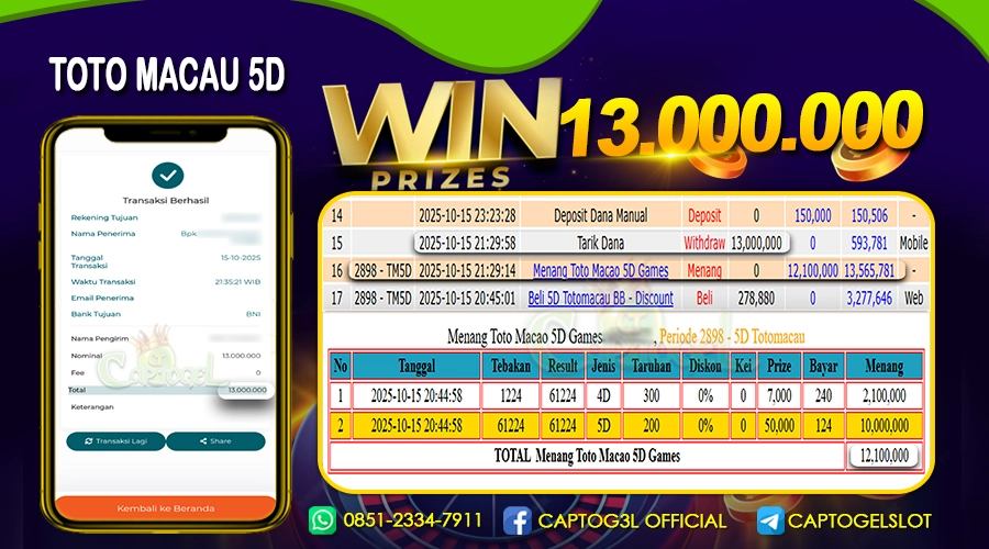 Read moreCAPTOGEL – Selamat Kepada Pemenang User ID: uhe*** dalam permainan TOTOMACAU 5D sebesar Rp 13.000.000 15 OKTOBER 2025 – bermain di situs game online terpercaya […]