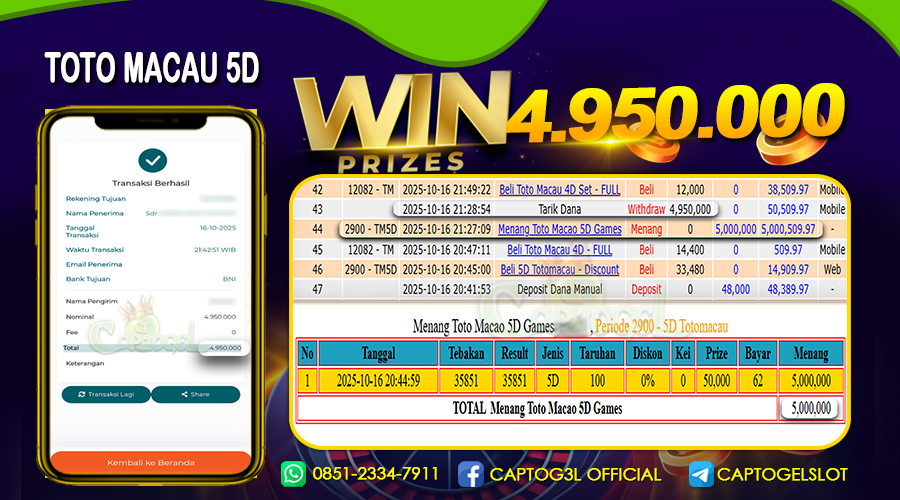 Read moreCAPTOGEL – Selamat Kepada Pemenang User ID: uwi*** dalam permainan TOTOMACAU 5D sebesar Rp 4.950.000 16 OKTOBER 2025 – bermain di situs game online terpercaya […]