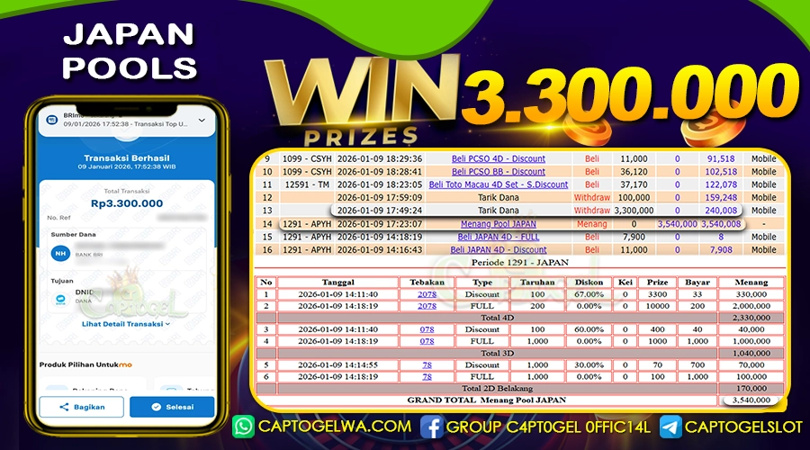 Read moreCAPTOGEL – Selamat Kepada Pemenang User ID: dr***i dalam permainan JAPAN POOLS sebesar Rp 3.300.000 09 JANUARI 2026 – bermain di situs game online terpercaya […]