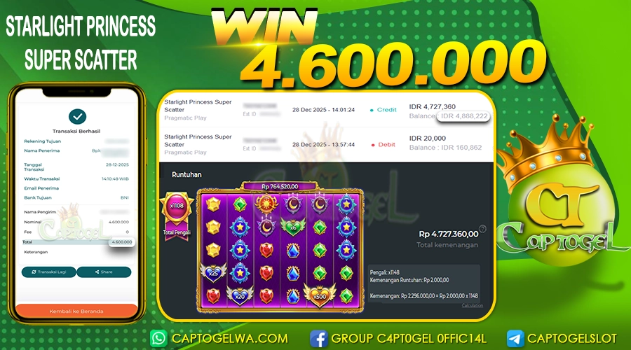 Read moreCAPTOGEL- JP STARLIGHT PRINCESS SUPER SCATTER 4 Juta 28 DESEMBER 2025