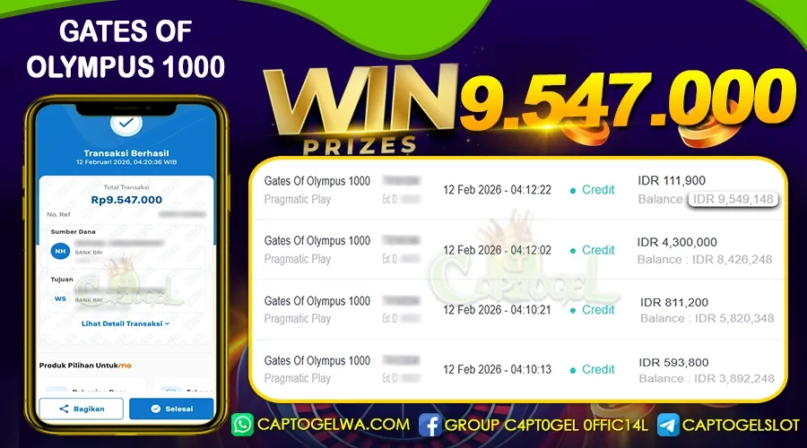 Kami juga merayakan kemenangan besar salah satu pemain setia CAPTOGEL, yang berhasil meraih kemenangan sebesar Rp 9.547.000 dalam permainan GATES OF OLYMPUS 1000 pada tanggal 12 FEBRUARI 2026. Kemenangan ini telah diproses dan dibayar lunas ke rekening yang terdaftar. Semoga kemenangan ini dapat menjadi motivasi bagi pemain lainnya untuk terus mencoba keberuntungan mereka dan menikmati pengalaman bermain yang menyenangkan di CAPTOGEL.