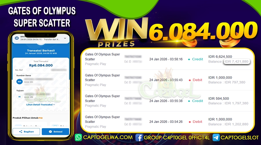Kami juga merayakan kemenangan besar salah satu pemain setia CAPTOGEL, yang berhasil meraih kemenangan sebesar Rp 6.084.000 dalam permainan GATES OF OLYMPUS SUPER SCATTER pada tanggal 24 JANUARI 2026. Kemenangan ini telah diproses dan dibayar lunas ke rekening yang terdaftar. Semoga kemenangan ini dapat menjadi motivasi bagi pemain lainnya untuk terus mencoba keberuntungan mereka dan menikmati pengalaman bermain yang menyenangkan di CAPTOGEL.