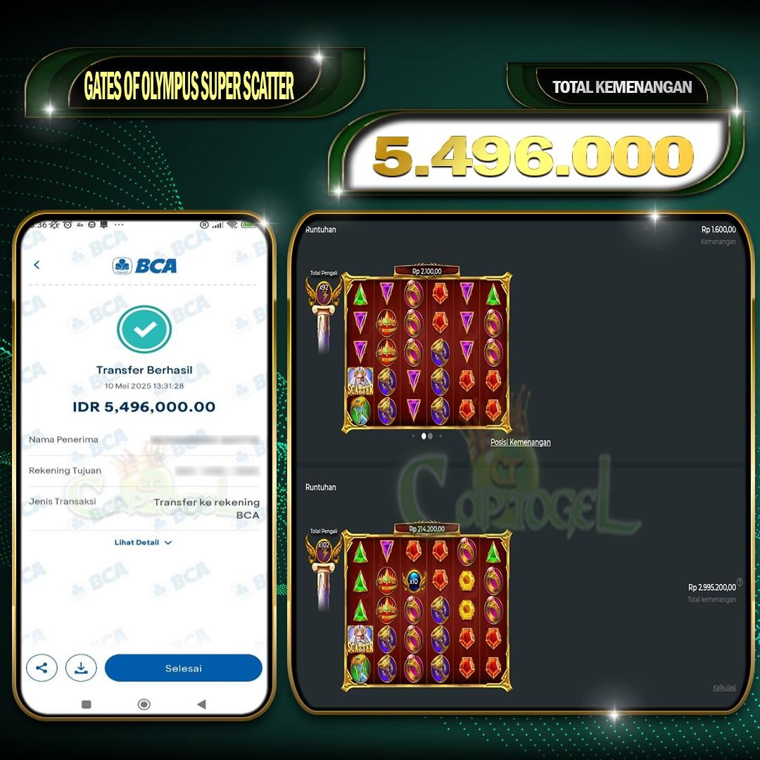 Kami juga merayakan kemenangan besar salah satu pemain setia CAPTOGEL, yang berhasil meraih kemenangan sebesar Rp 5.000.000 dalam permainan GATES OF OLYMPUS SUPER SCATTER pada tanggal 10 MEI 2025. Kemenangan ini telah diproses dan dibayar lunas ke rekening yang terdaftar. Semoga kemenangan ini dapat menjadi motivasi bagi pemain lainnya untuk terus mencoba keberuntungan mereka dan menikmati pengalaman bermain yang menyenangkan di CAPTOGEL.