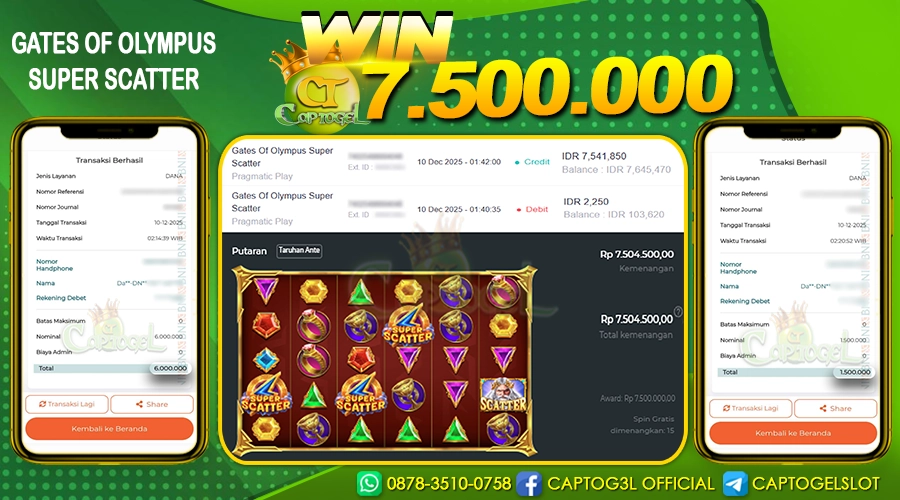 Kami juga merayakan kemenangan besar salah satu pemain setia CAPTOGEL, yang berhasil meraih kemenangan sebesar Rp 7.500.000 dalam permainan GATES OF OLYMPUS SUPER SCATTER pada tanggal 10 DESEMBER 2025. Kemenangan ini telah diproses dan dibayar lunas ke rekening yang terdaftar. Semoga kemenangan ini dapat menjadi motivasi bagi pemain lainnya untuk terus mencoba keberuntungan mereka dan menikmati pengalaman bermain yang menyenangkan di CAPTOGEL.