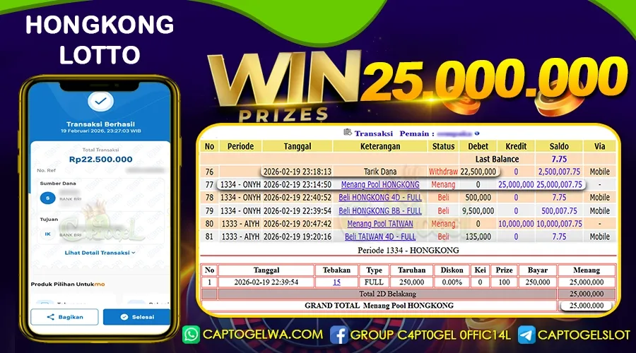 CAPTOGEL – Selamat Kepada Pemenang User ID: re***o dalam permainan HONGKONG LOTTO sebesar Rp 25.000.000 19 FEBRUARI 2026 – bermain di situs game online terpercaya yang telah terbukti dengan bukti jackpot (JP) yang resmi dan terjamin di Indonesia. Platform ini memberikan pengalaman bermain yang aman dan menyenangkan bagi para penggemar game online. Dengan hadirnya CAPTOGEL, pemain dapat menikmati kemudahan akses ke berbagai permainan seru, peluang untuk memenangkan hadiah besar, serta berbagai keuntungan menarik yang telah disiapkan khusus untuk member lama maupun member baru. CAPTOGEL dirancang dengan fokus pada kenyamanan dan keamanan pemain, memastikan bahwa setiap pemain dapat bermain dengan tenang, tanpa khawatir, dan meraih keuntungan maksimal. Dengan pembuktian kemenangan seperti yang diraih oleh User ID: re***o dalam permainan JP HONGKONG LOTTO , CAPTOGEL semakin menunjukkan komitmennya sebagai platform yang memberikan kesempatan menang nyata kepada para penggunanya.