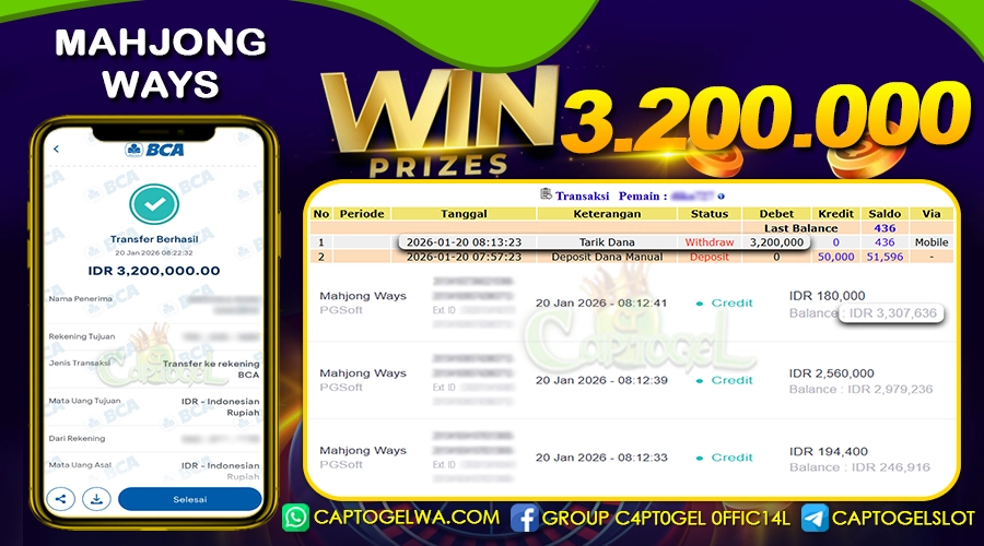CAPTOGEL – Selamat Kepada Pemenang User ID: ur***3 dalam permainan MAHJONG WAYS sebesar Rp 3.200.000 20 JANUARI 2026 – bermain di situs game online terpercaya yang telah terbukti dengan bukti jackpot (JP) yang resmi dan terjamin di Indonesia. Platform ini memberikan pengalaman bermain yang aman dan menyenangkan bagi para penggemar game online. Dengan hadirnya CAPTOGEL, pemain dapat menikmati kemudahan akses ke berbagai permainan seru, peluang untuk memenangkan hadiah besar, serta berbagai keuntungan menarik yang telah disiapkan khusus untuk member lama maupun member baru. CAPTOGEL dirancang dengan fokus pada kenyamanan dan keamanan pemain, memastikan bahwa setiap pemain dapat bermain dengan tenang, tanpa khawatir, dan meraih keuntungan maksimal. Dengan pembuktian kemenangan seperti yang diraih oleh User ID: ur***3 dalam permainan JP MAHJONG WAYS , CAPTOGEL semakin menunjukkan komitmennya sebagai platform yang memberikan kesempatan menang nyata kepada para penggunanya.