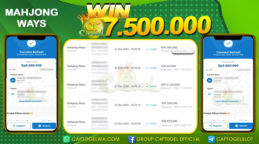 Kami juga merayakan kemenangan besar salah satu pemain setia CAPTOGEL, yang berhasil meraih kemenangan sebesar Rp 7.500.000 dalam permainan MAHJONG WAYS pada tanggal 21 DESEMBER 2025. Kemenangan ini telah diproses dan dibayar lunas ke rekening yang terdaftar. Semoga kemenangan ini dapat menjadi motivasi bagi pemain lainnya untuk terus mencoba keberuntungan mereka dan menikmati pengalaman bermain yang menyenangkan di CAPTOGEL.