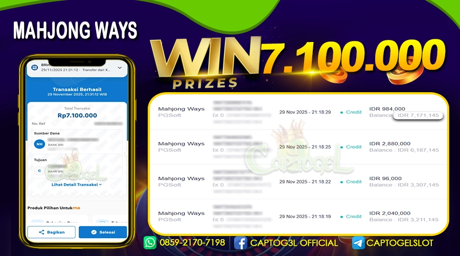 Kami juga merayakan kemenangan besar salah satu pemain setia CAPTOGEL, yang berhasil meraih kemenangan sebesar Rp 7.100.000 dalam permainan MAHJONG WAYS pada tanggal 29 NOVEMBER 2025. Kemenangan ini telah diproses dan dibayar lunas ke rekening yang terdaftar. Semoga kemenangan ini dapat menjadi motivasi bagi pemain lainnya untuk terus mencoba keberuntungan mereka dan menikmati pengalaman bermain yang menyenangkan di CAPTOGEL.