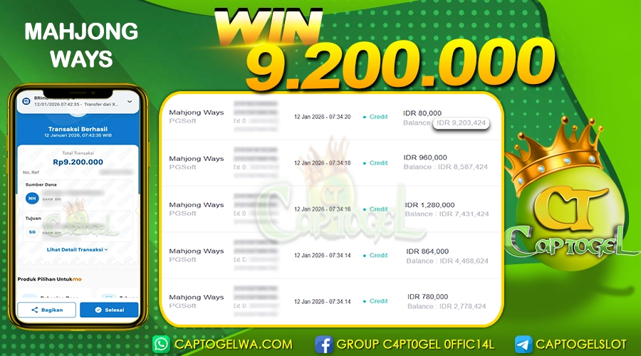 CAPTOGEL – Selamat Kepada Pemenang User ID: er***b dalam permainan MAHJONG WAYS sebesar Rp 9.200.000 12 JANUARI 2026 – bermain di situs game online terpercaya yang telah terbukti dengan bukti jackpot (JP) yang resmi dan terjamin di Indonesia. Platform ini memberikan pengalaman bermain yang aman dan menyenangkan bagi para penggemar game online. Dengan hadirnya CAPTOGEL, pemain dapat menikmati kemudahan akses ke berbagai permainan seru, peluang untuk memenangkan hadiah besar, serta berbagai keuntungan menarik yang telah disiapkan khusus untuk member lama maupun member baru. CAPTOGEL dirancang dengan fokus pada kenyamanan dan keamanan pemain, memastikan bahwa setiap pemain dapat bermain dengan tenang, tanpa khawatir, dan meraih keuntungan maksimal. Dengan pembuktian kemenangan seperti yang diraih oleh User ID: er***b dalam permainan JP MAHJONG WAYS , CAPTOGEL semakin menunjukkan komitmennya sebagai platform yang memberikan kesempatan menang nyata kepada para penggunanya.