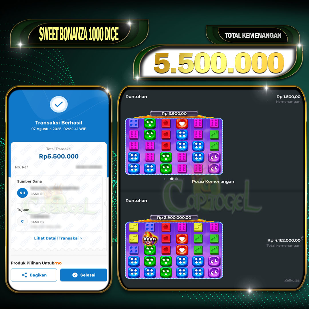 Kami juga merayakan kemenangan besar salah satu pemain setia CAPTOGEL, yang berhasil meraih kemenangan sebesar Rp 5.500.000 dalam permainan SWEET BONANZA 1000 DICE pada tanggal 07 AGUSTUS 2025. Kemenangan ini telah diproses dan dibayar lunas ke rekening yang terdaftar. Semoga kemenangan ini dapat menjadi motivasi bagi pemain lainnya untuk terus mencoba keberuntungan mereka dan menikmati pengalaman bermain yang menyenangkan di CAPTOGEL.
