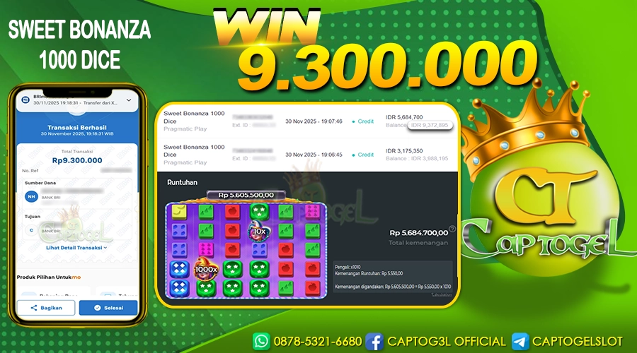 Kami juga merayakan kemenangan besar salah satu pemain setia CAPTOGEL, yang berhasil meraih kemenangan sebesar Rp 9.300.000 dalam permainan SWEET BONANZA 1000 DICE pada tanggal 30 NOVEMBER 2025. Kemenangan ini telah diproses dan dibayar lunas ke rekening yang terdaftar. Semoga kemenangan ini dapat menjadi motivasi bagi pemain lainnya untuk terus mencoba keberuntungan mereka dan menikmati pengalaman bermain yang menyenangkan di CAPTOGEL.