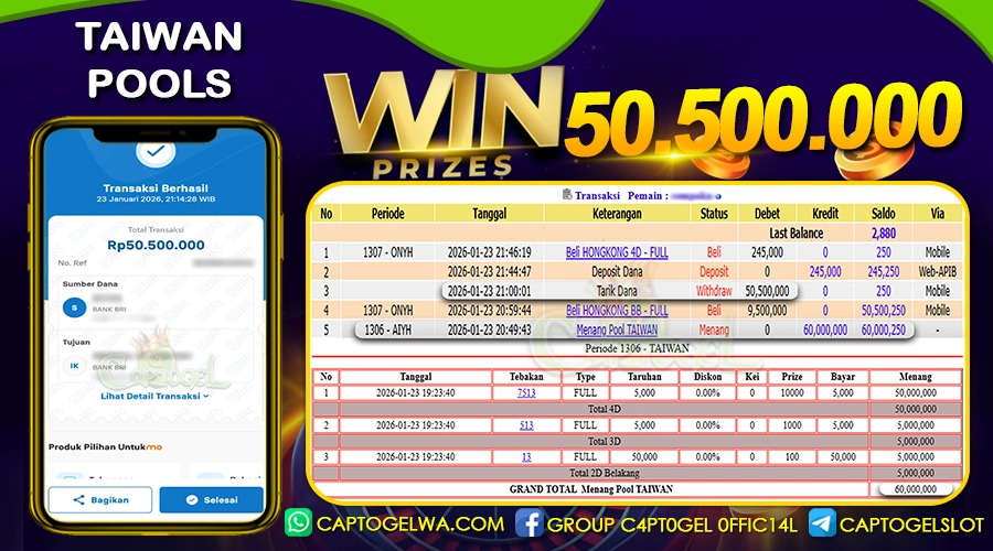 Kami juga merayakan kemenangan besar salah satu pemain setia CAPTOGEL, yang berhasil meraih kemenangan sebesar Rp 50.500.000 dalam permainan TAIWAN POOLS pada tanggal 23 JANUARI 2026. Kemenangan ini telah diproses dan dibayar lunas ke rekening yang terdaftar. Semoga kemenangan ini dapat menjadi motivasi bagi pemain lainnya untuk terus mencoba keberuntungan mereka dan menikmati pengalaman bermain yang menyenangkan di CAPTOGEL.