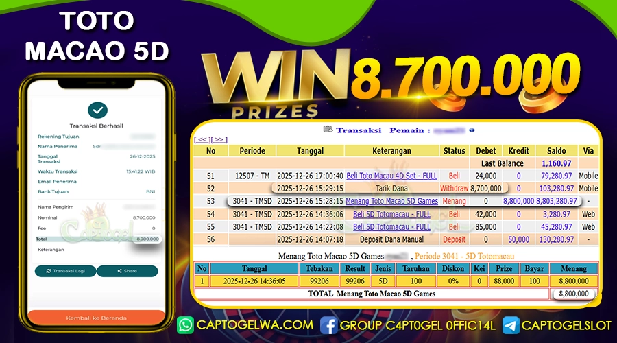JACKPOT TOTO MACAO 5D MENANGKAN DI CAPTOGEL 26 DESEMBER 2025