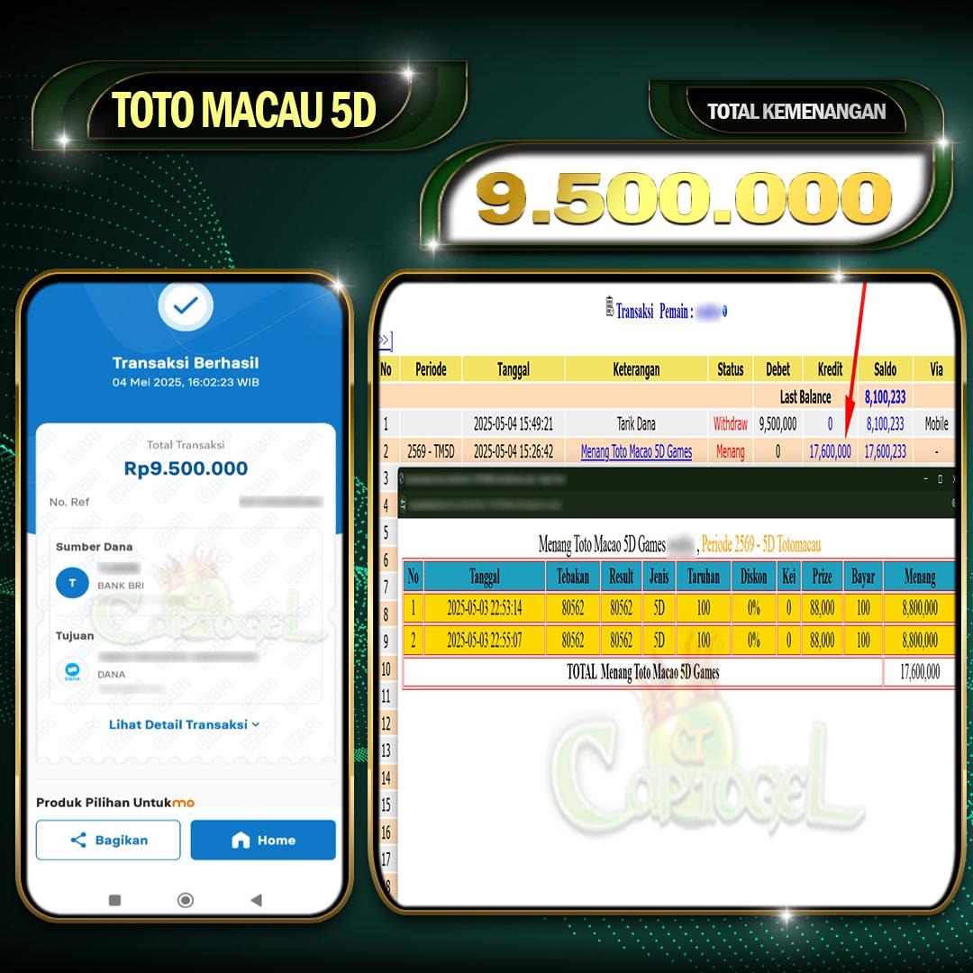 Kami juga merayakan kemenangan besar salah satu pemain setia CAPTOGEL, yang berhasil meraih kemenangan sebesar Rp 9.000.000 dalam permainan TOTOMACAU 4D pada tanggal 04 MEI 2025. Kemenangan ini telah diproses dan dibayar lunas ke rekening yang terdaftar. Semoga kemenangan ini dapat menjadi motivasi bagi pemain lainnya untuk terus mencoba keberuntungan mereka dan menikmati pengalaman bermain yang menyenangkan di CAPTOGEL.
