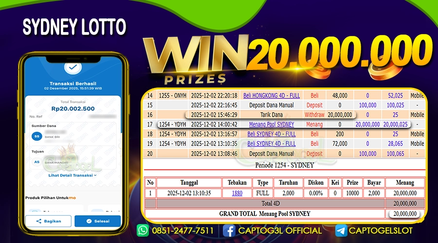 Read moreCAPTOGEL – Selamat Kepada Pemenang User ID: iwe*** dalam permainan SYDNEY LOTTO sebesar Rp 20.000.000 02 DESEMBER 2025 – bermain di situs game online terpercaya yang […]
