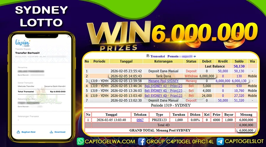 Read moreCAPTOGEL – Selamat Kepada Pemenang User ID: vi***o dalam permainan SYDNEY LOTTO sebesar Rp 6.000.000 05 FEBRUARI 2026 – bermain di situs game online terpercaya […]