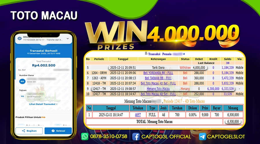 Read moreCAPTOGEL – Selamat Kepada Pemenang User ID: fos*** dalam permainan TOTO MACAU sebesar Rp 4.000.000 11 DESEMBER 2025 – bermain di situs game online terpercaya yang […]
