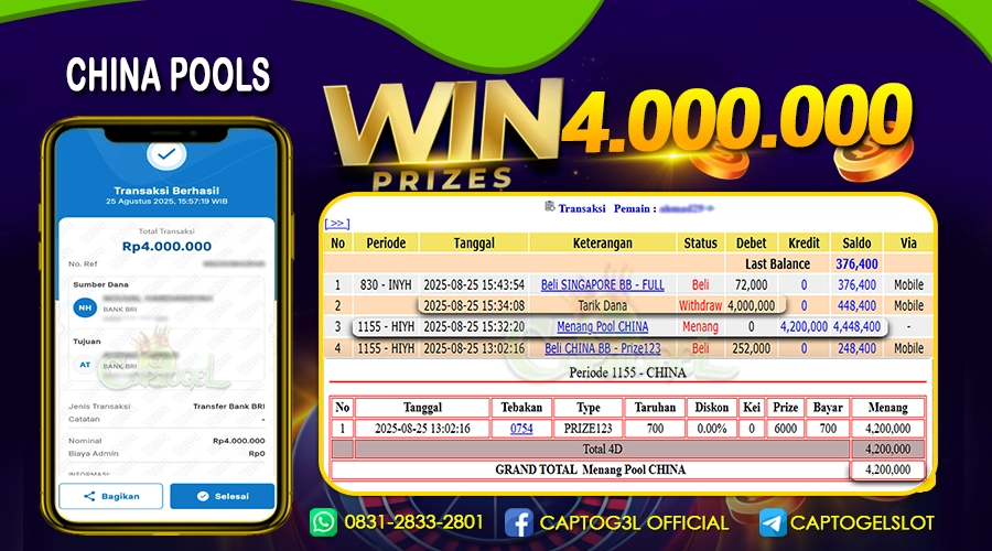 CAPTOGEL – Selamat Kepada Pemenang User ID: jmb*** dalam permainan CHINA POOLS sebesar Rp 4.000.000 25 AGUSTUS 2025 – bermain di situs game online terpercaya […]