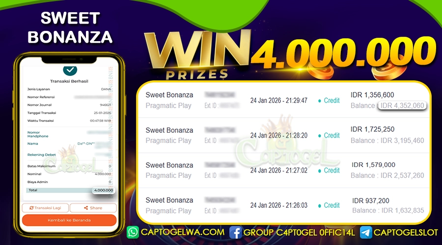 CAPTOGEL – Selamat Kepada Pemenang User ID: oe***w dalam permainan SWEET BONANZA sebesar Rp 4.000.000 24 JANUARI 2026 – bermain di situs game online terpercaya […]