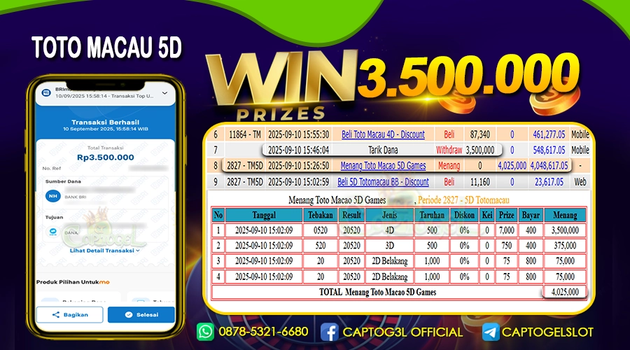 CAPTOGEL – Selamat Kepada Pemenang User ID: pru*** dalam permainan TOTOMACAU 5D sebesar Rp 3.500.000 10 SEPTEMBER 2025 – bermain di situs game online terpercaya […]